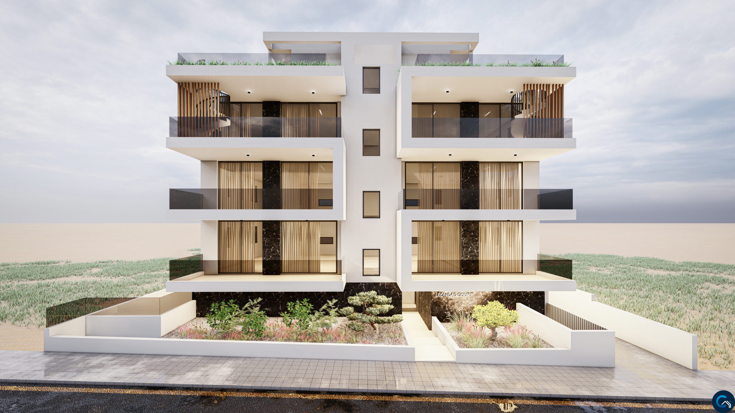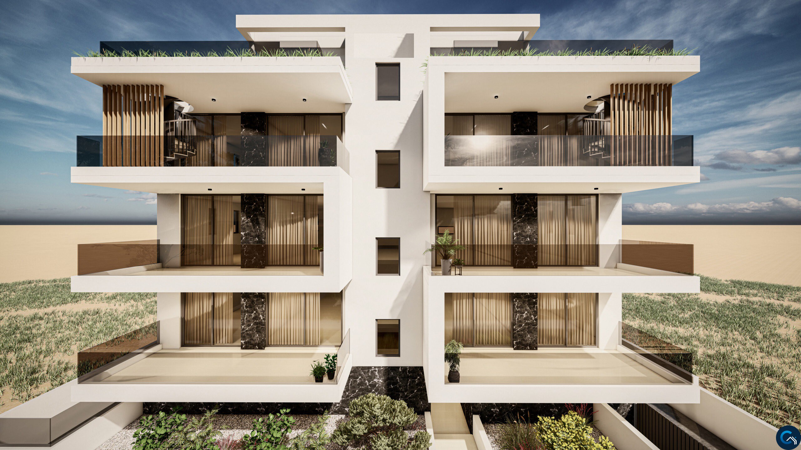 Only two apartments on each of the three floors, with the third-floor units enjoying private and individual access to a large roof garden on the 4th floor with its barbeque area as well as an extra wc-shower and room that can be converted into 3rd bedroom. Furthermore, these top floor units will have net metering and a photovoltaic system.
