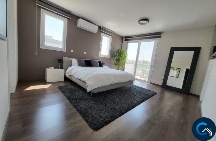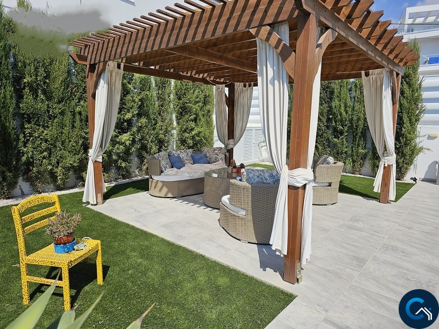 Three-bedroom bungalow for sale in Pervolia, Larnaca. Located on a corner plot, in a quiet, family-friendly neighbourhood, in gated complex, next to a green area. Easy access to the main roads and the beach (1.5km). The house consists of: a living room, partly open kitchen, three bedrooms (master bedroom with ensuite facilities), main bathroom, garden with mature fruit trees and private pool.