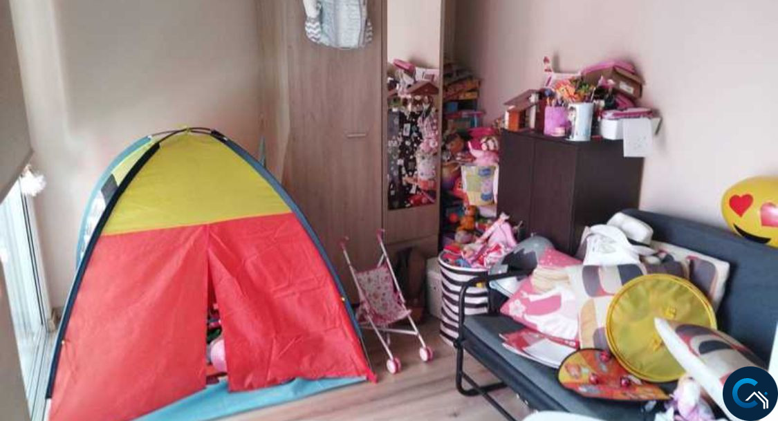 The house is 125sqm approximately, it has 3 bedrooms (2 bedrooms on the first floor plus a playroom on the ground floor, could be used as a third bedroom). It has a small back yard and 30sqm patio infront of the house. Large living room with dinning area, separate kitchen, one main bathroom and a guest WC.
